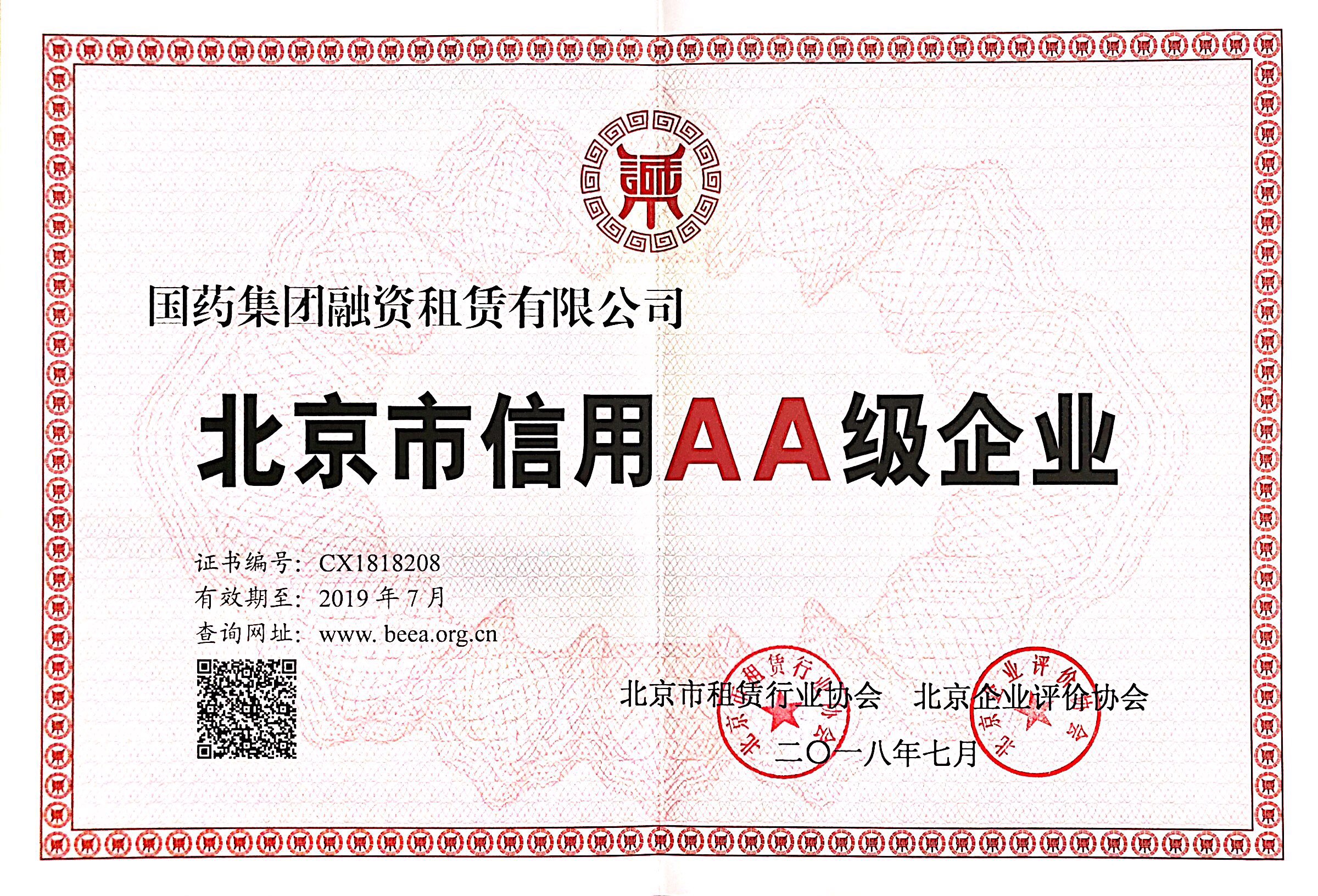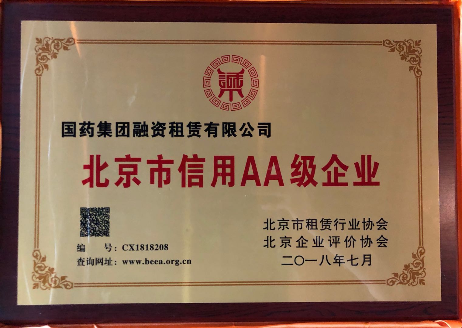 2018年7月15日,經(jīng)北京市租賃協(xié)會(huì)推薦、北京市企業(yè)信用評(píng)價(jià)活動(dòng)秘書處公示,國藥集團(tuán)融資租賃有限公司獲得“北京市信用AA級(jí)企業(yè)”稱號(hào)。