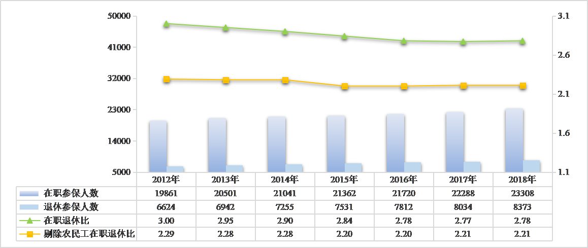 1、參保人數(shù)持續(xù)增加。2018年,參加職工醫(yī)保31681萬人,比上年增長4.5%。其中在職職工23308萬人,比上年增長4.6%;退休職工8373萬人,比上年增長4.2%。在職退休比為2.78,同比略微上升。