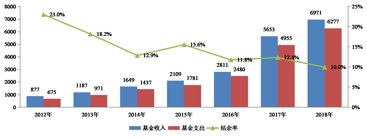 2、基金收支規(guī)模不斷擴(kuò)大。2018年,居民醫(yī)?;鹗杖?971億元,支出6277億元,分別比上年增長23.3%、26.7%[4]。2018年,居民醫(yī)保基金當(dāng)期結(jié)存694.6億元,累計結(jié)存4372.3億元。