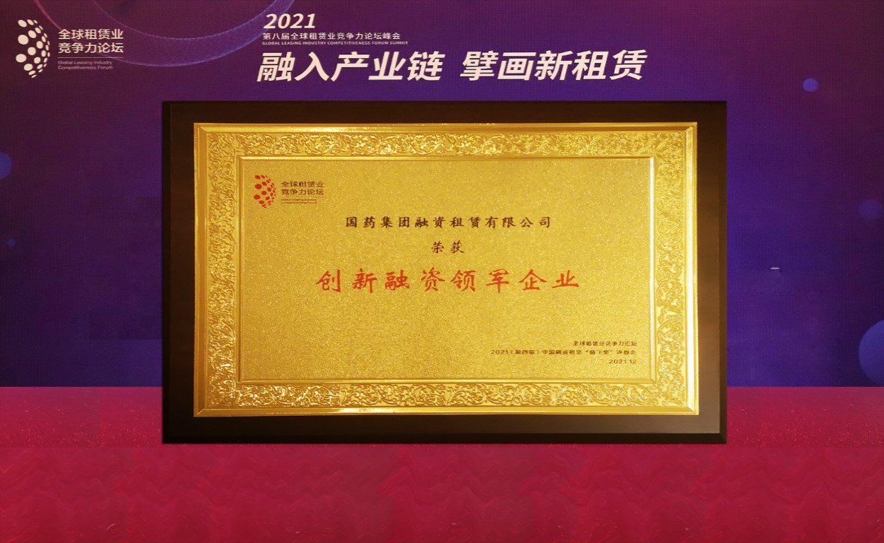 12月22日至23日,主題為“融入產(chǎn)業(yè)鏈,擘畫(huà)新租賃”的2021(第八屆)全球租賃業(yè)競(jìng)爭(zhēng)力論壇峰會(huì)在天津舉辦。國(guó)藥集團(tuán)融資租賃有限公司在峰會(huì)舉辦的2021(第八屆)中國(guó)融資租賃“騰飛獎(jiǎng)”評(píng)選中,憑借在融資創(chuàng)新領(lǐng)域取得的成績(jī),榮獲“創(chuàng)新融資領(lǐng)軍企業(yè)”稱號(hào)。